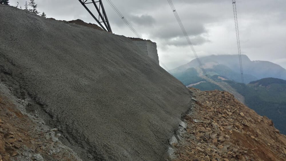 Weaving through all the intricacies, the result was a work of art.Perched at the top of a mountain ridge, the final design involved a matrix of micropiles, tieback anchors, grout injection, shotcrete, and one of their soil stabilization innovations, the innovative Geosynthetically Confined Soil® (GCS®) wall as a retaining wall buildout. Working on top of the ridge’s crest, the crews began drilling the soil nails horizontally into the slope around the existing foundation to act as tiebacks and stabilize its front face. Grout was injected into the rock fractures to fill existing voids and further support the underpinning foundation. A steel-reinforcing element was then secured to the soil anchors before shotcrete was applied to the face. Once complete, micropiles were installed vertically into the slope to provide a solid base for the retaining wall. Then, the crews built the GCS® retaining wall atop the micropiles to prevent further erosion around the transmission tower’s foundations.