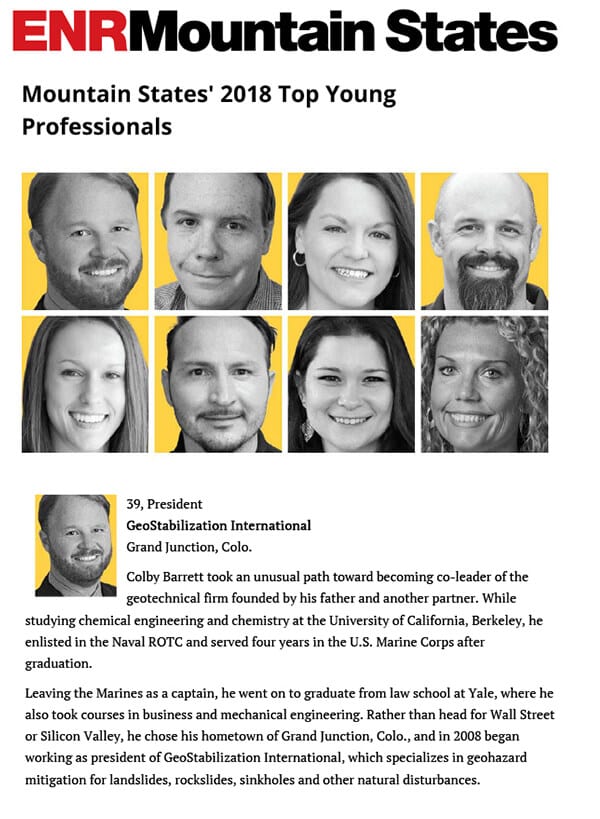 Engineering News-Record (ENR) Mountain States recently chose Colby Barrett, CEO of GeoStabilization International® as a Top Young Professional for 2018. The competition, which recognizes up-and-coming industry leaders under the age of 40 from across Colorado, Wyoming, North Dakota, South Dakota, Utah, Idaho, and Montana attracted nominations from across the seven-state region. All of this year’s winners have demonstrated a mastery of new technologies and a willingness to teach their colleagues about better design and construction practices. Other key criteria included achievement of or progress toward industry certifications, success in creating more efficient systems, designing new processes or managing landmark projects, and volunteer work across the industry and within the community.