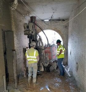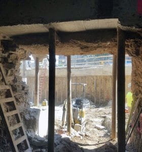 Geostabilization International helped develop an overall solution for underpinning portions of the 4-story structure and enabling access to the basement level for the proposed expansion. Working in conjunction with the structural engineer and general contractor, GeoStabilization formulated a plan to use micropile shoring for access to the basement, then to underpin relevant portions of the existing structure with a combination of micropiles and conventional underpinning pits. The “A-Frame” shoring system designed by GSI allowed access to the current basement level for the renovations and expansion as well as overcoming challenges presented by the overhead electrical hazards.