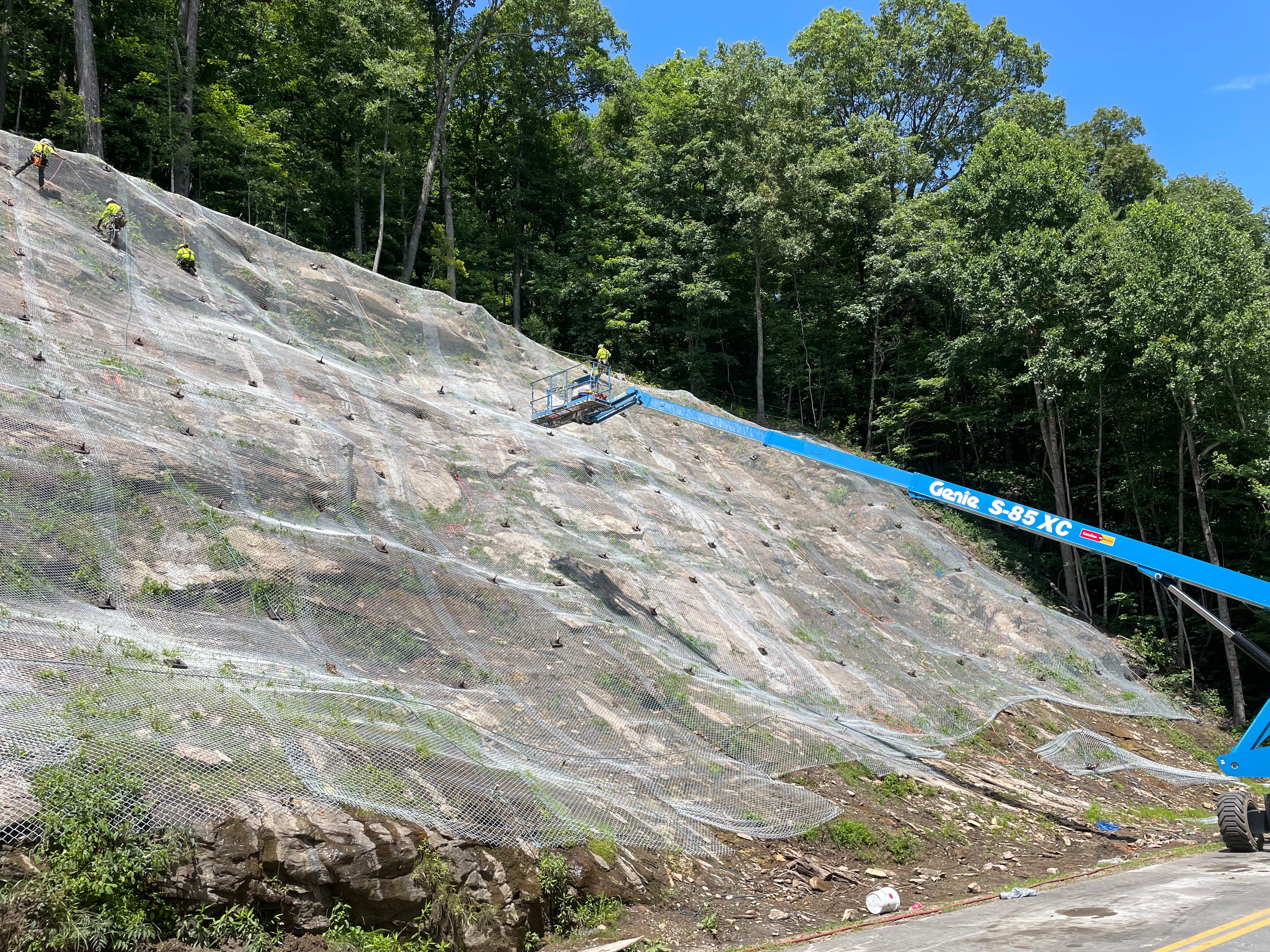- Mesh Installation: High-tensile steel mesh panels are positioned across the rock surface, secured to the anchors using steel plates and wire rope.