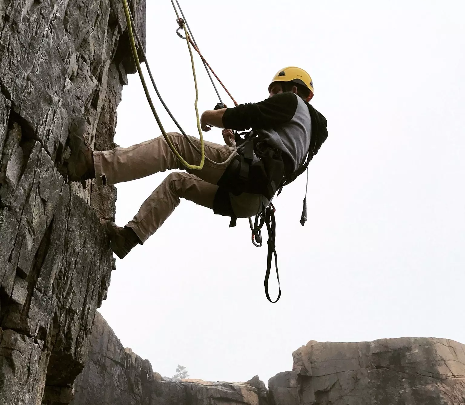 Rock scaling worker on cliff face for rockfall hazard removal
