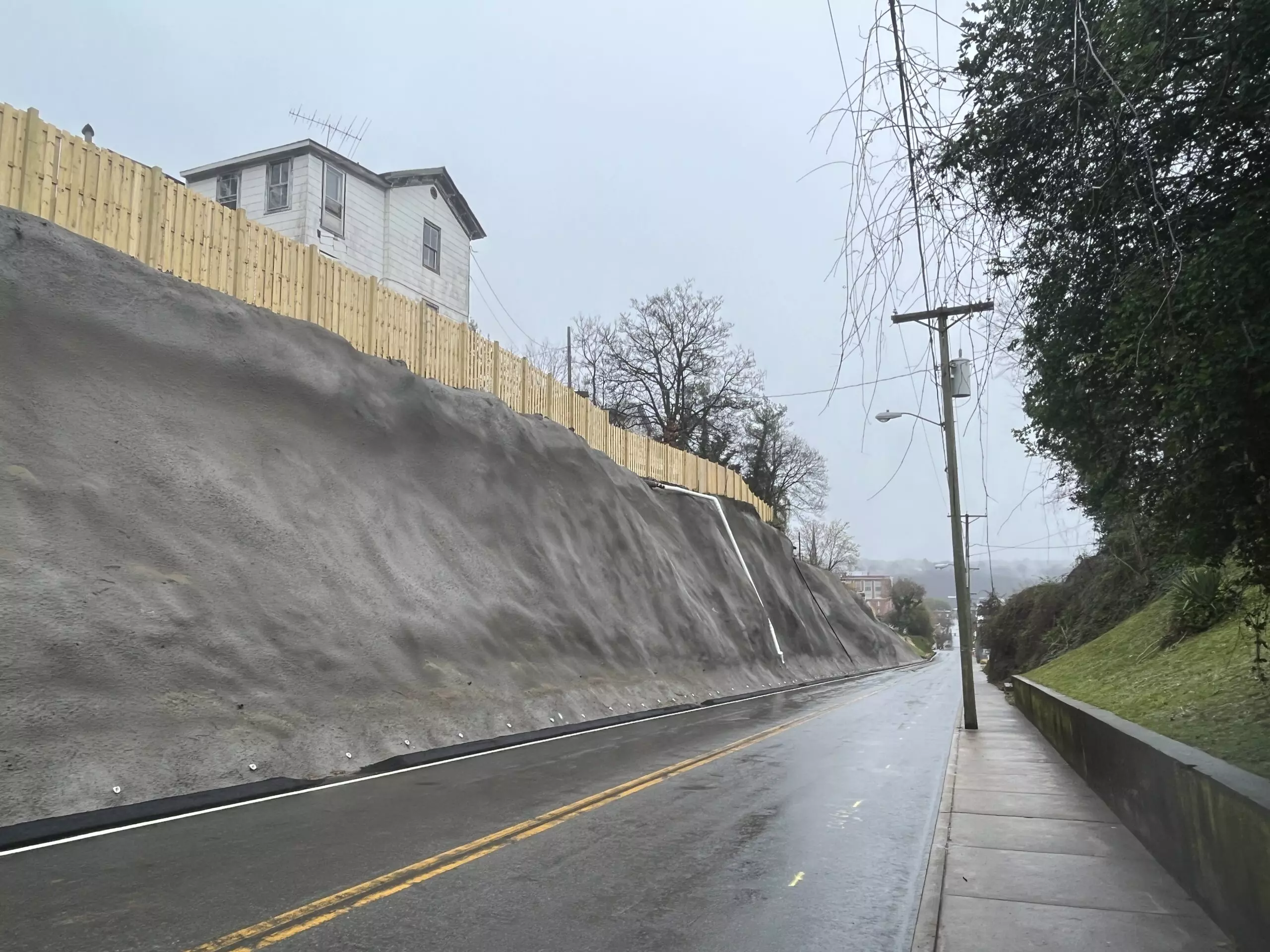 Completed shotcrete earth retention wall beside road, 12th Street