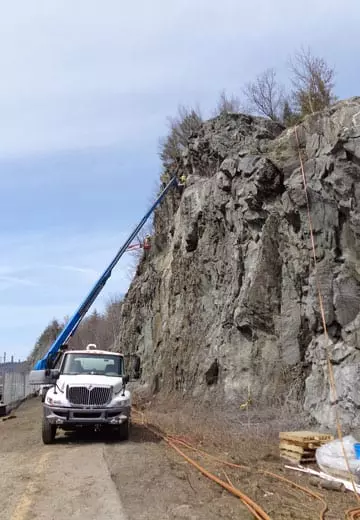 Rock bolt installation on I-89 Vermont highway rock slope