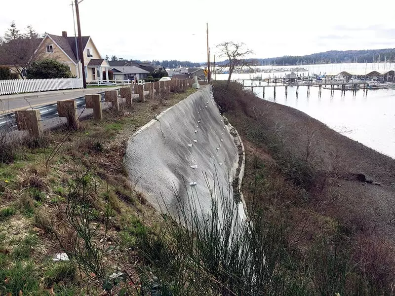 A city in Washington State contracted GeoStabilization International®, experts in engineered soil repairs, to provide bluff stabilization along a roadway within the scenic waterfront area on the bay’s east bank. Over time, erosion caused the slope to lose its soil retention properties, resulting in the loss of road shoulder and compromising the southbound travel lane’s stability.